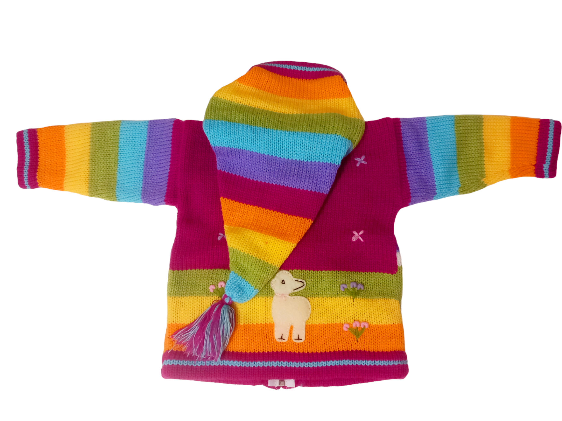 The sweater features a pink base color with multicolor striped accents on the sleeves and hood, creating a cheerful and eye-catching look. A full front zipper closure makes dressing quick and easy, perfect for everyday use.