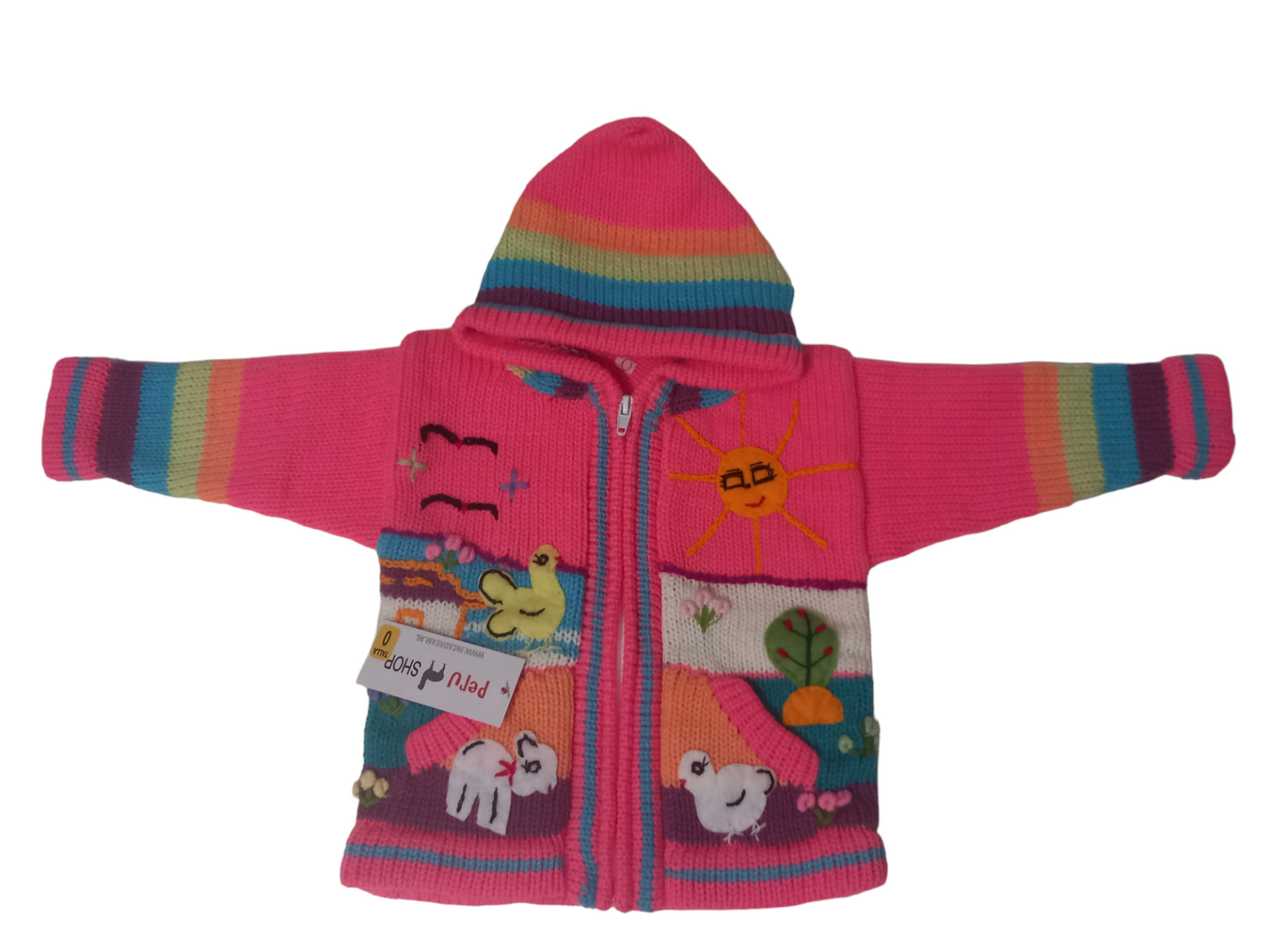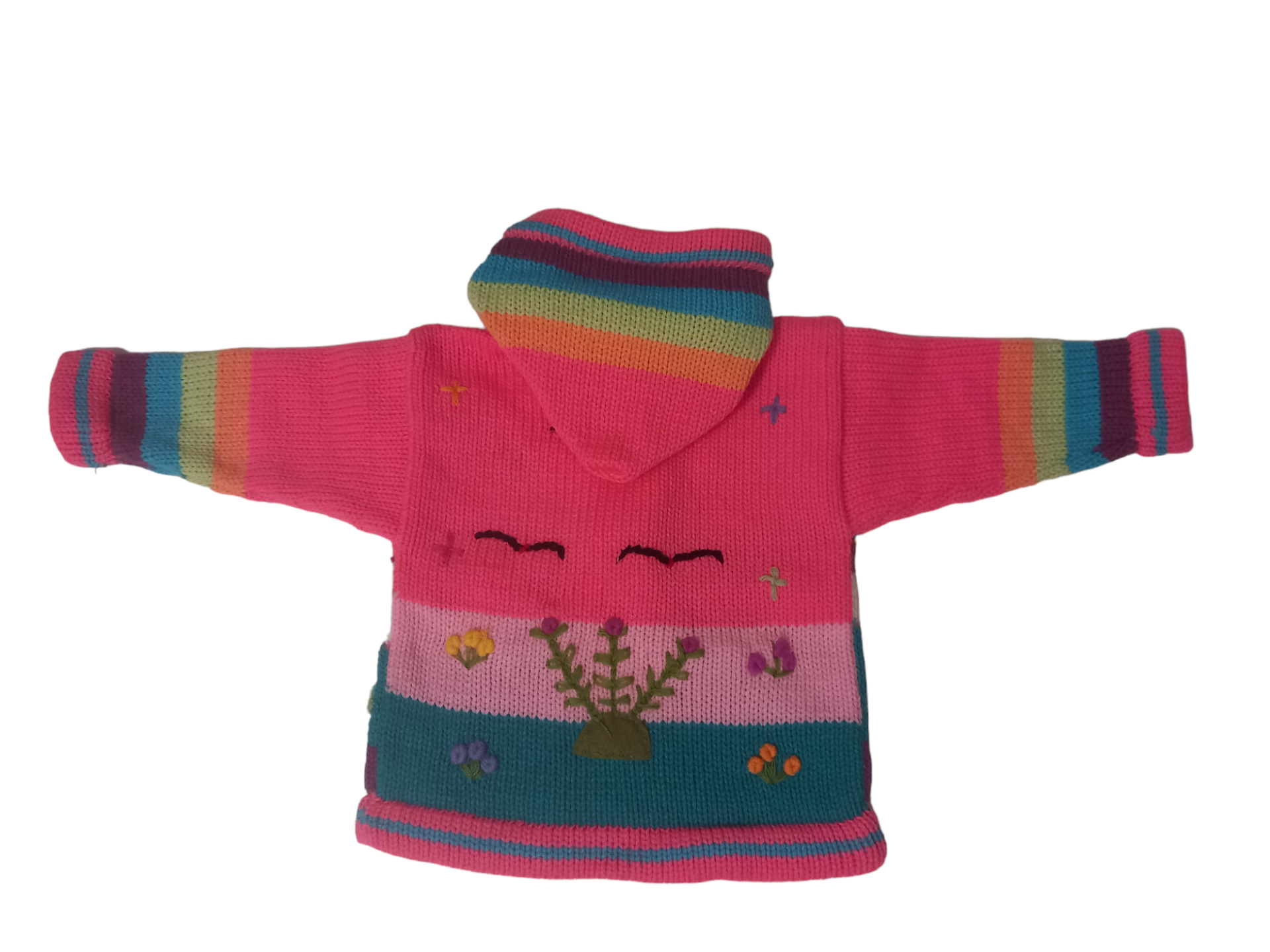 Beautiful embroidered appliqués on both the front and back showcase playful, nature-inspired motifs including a smiling sun, mountains, houses, flowers, and birds. These detailed handcrafted elements give the sweater a unique artisanal style, ideal for parents looking for special and distinctive baby clothing.
