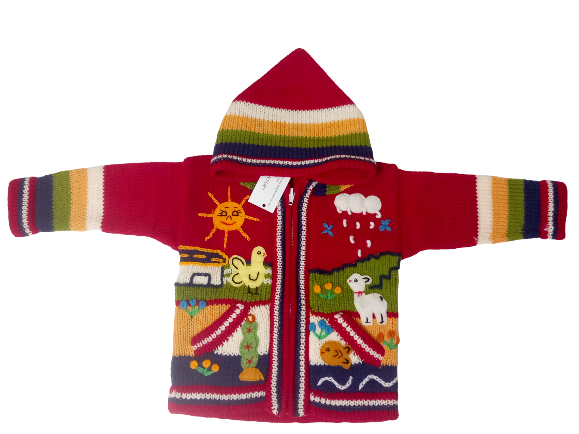 Beautiful embroidered appliqués on both the front and back showcase playful, nature-inspired motifs including a smiling sun, mountains, houses, flowers, and birds. These detailed handcrafted elements give the sweater a unique artisanal style, ideal for parents looking for special and distinctive baby clothing.