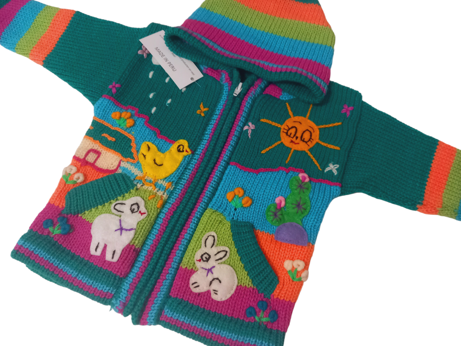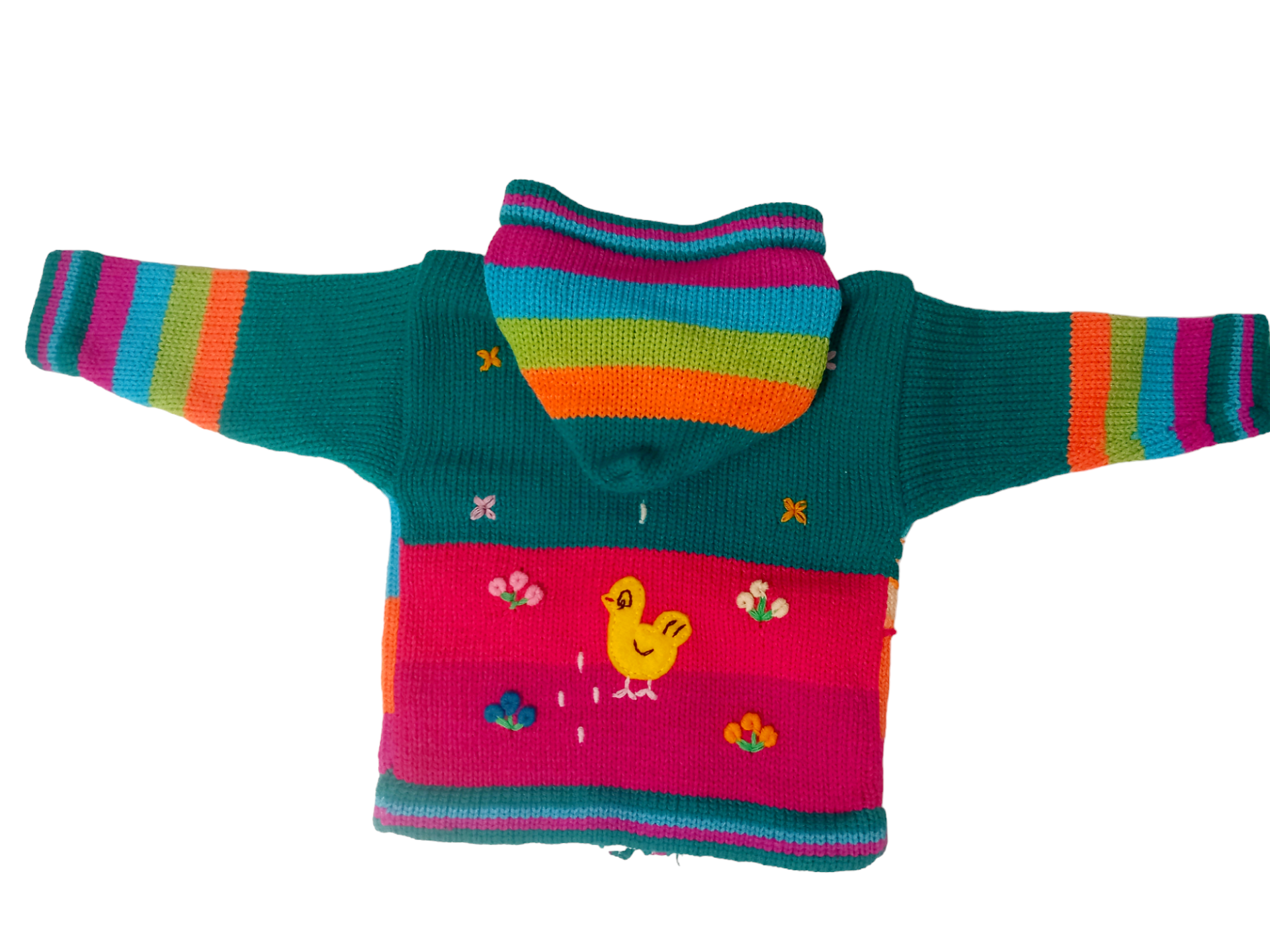 Beautiful embroidered appliqués on both the front and back showcase playful, nature-inspired motifs including a smiling sun, mountains, houses, flowers, and birds. These detailed handcrafted elements give the sweater a unique artisanal style, ideal for parents looking for special and distinctive baby clothing.