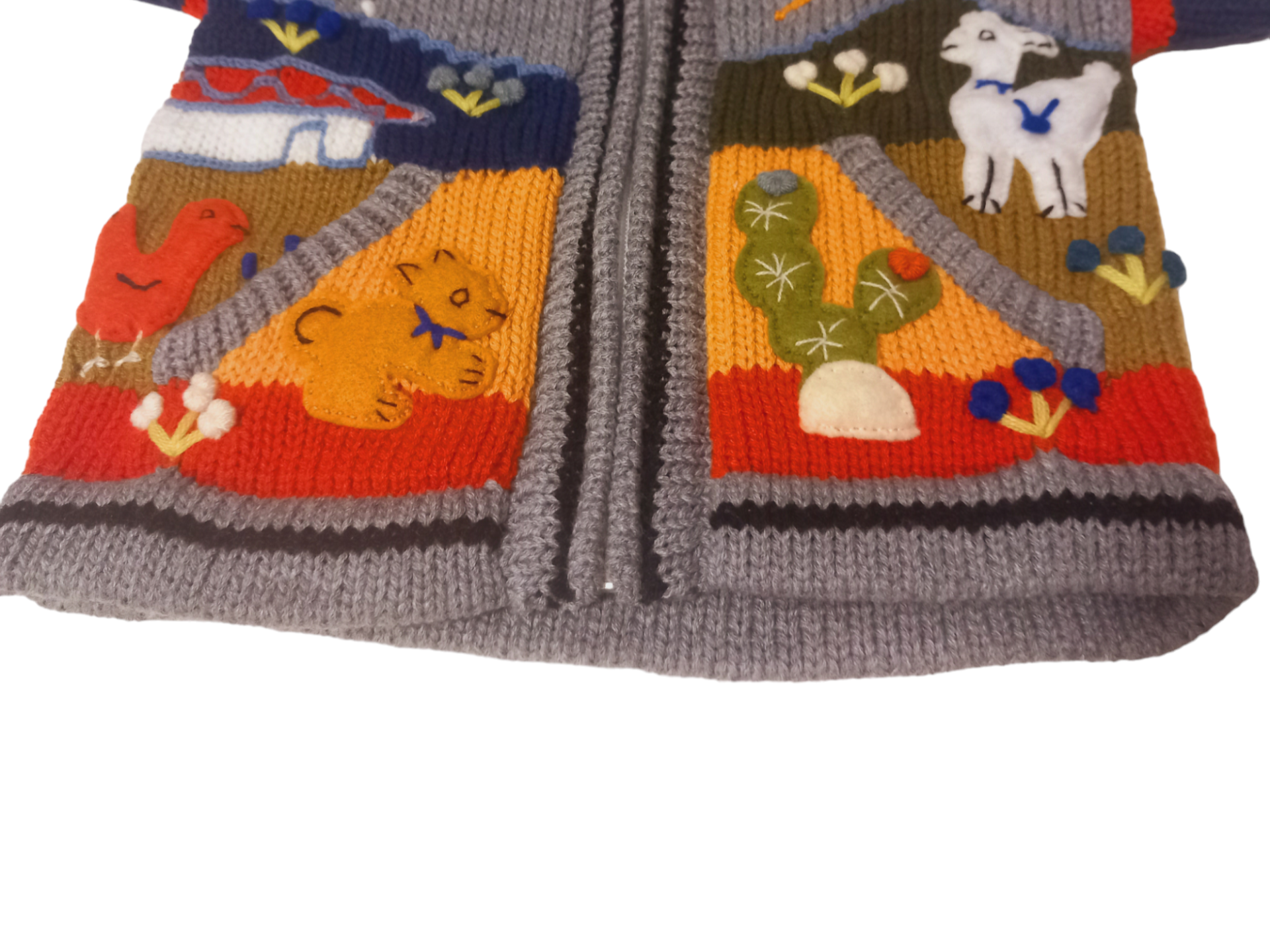 Beautiful embroidered appliqués on both the front and back showcase playful, nature-inspired motifs including a smiling sun, mountains, houses, flowers, and birds. These detailed handcrafted elements give the sweater a unique artisanal style, ideal for parents looking for special and distinctive baby clothing.