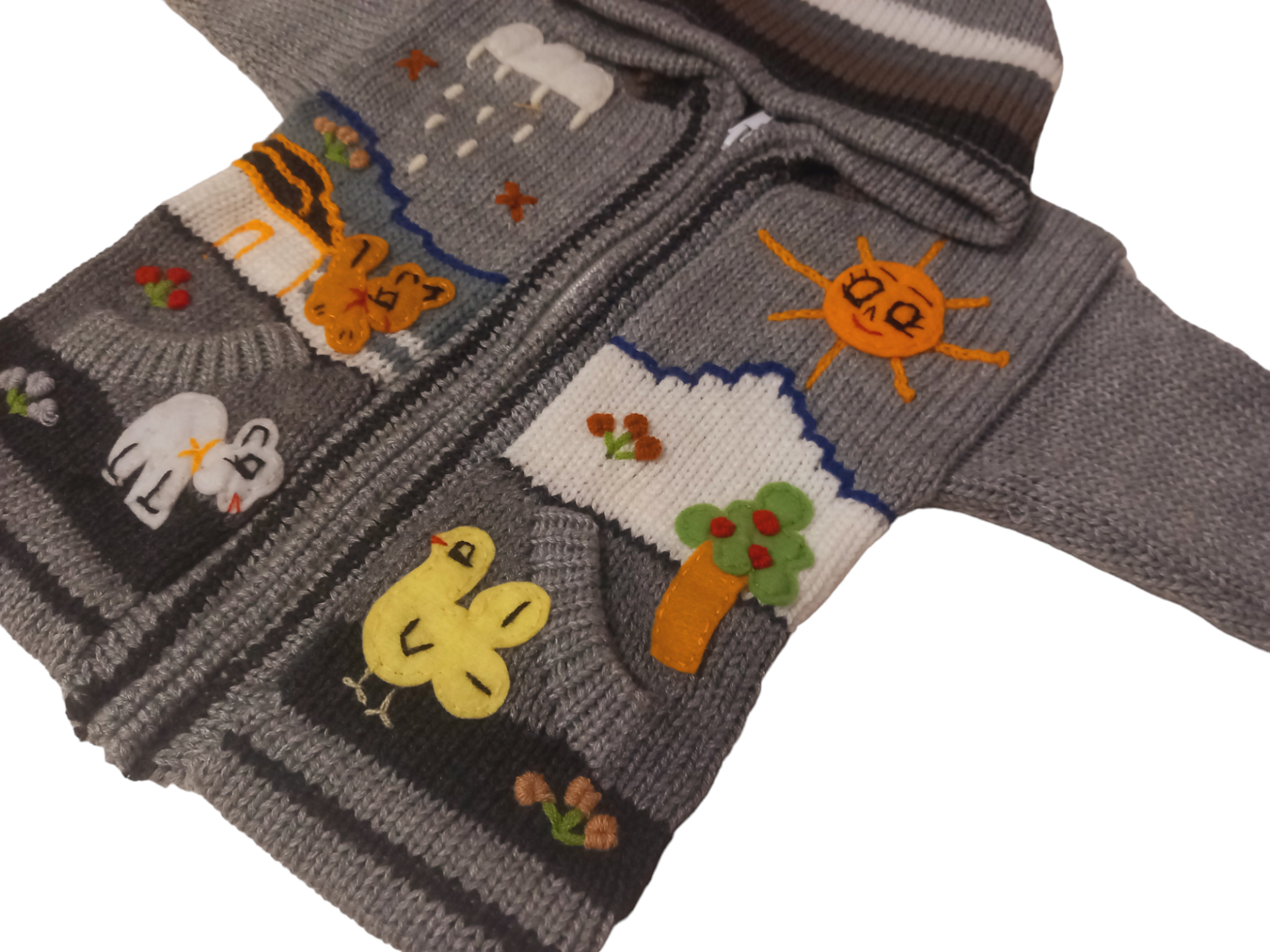 Beautiful embroidered appliqués on both the front and back showcase playful, nature-inspired motifs including a smiling sun, mountains, houses, flowers, and birds. These detailed handcrafted elements give the sweater a unique artisanal style, ideal for parents looking for special and distinctive baby clothing.